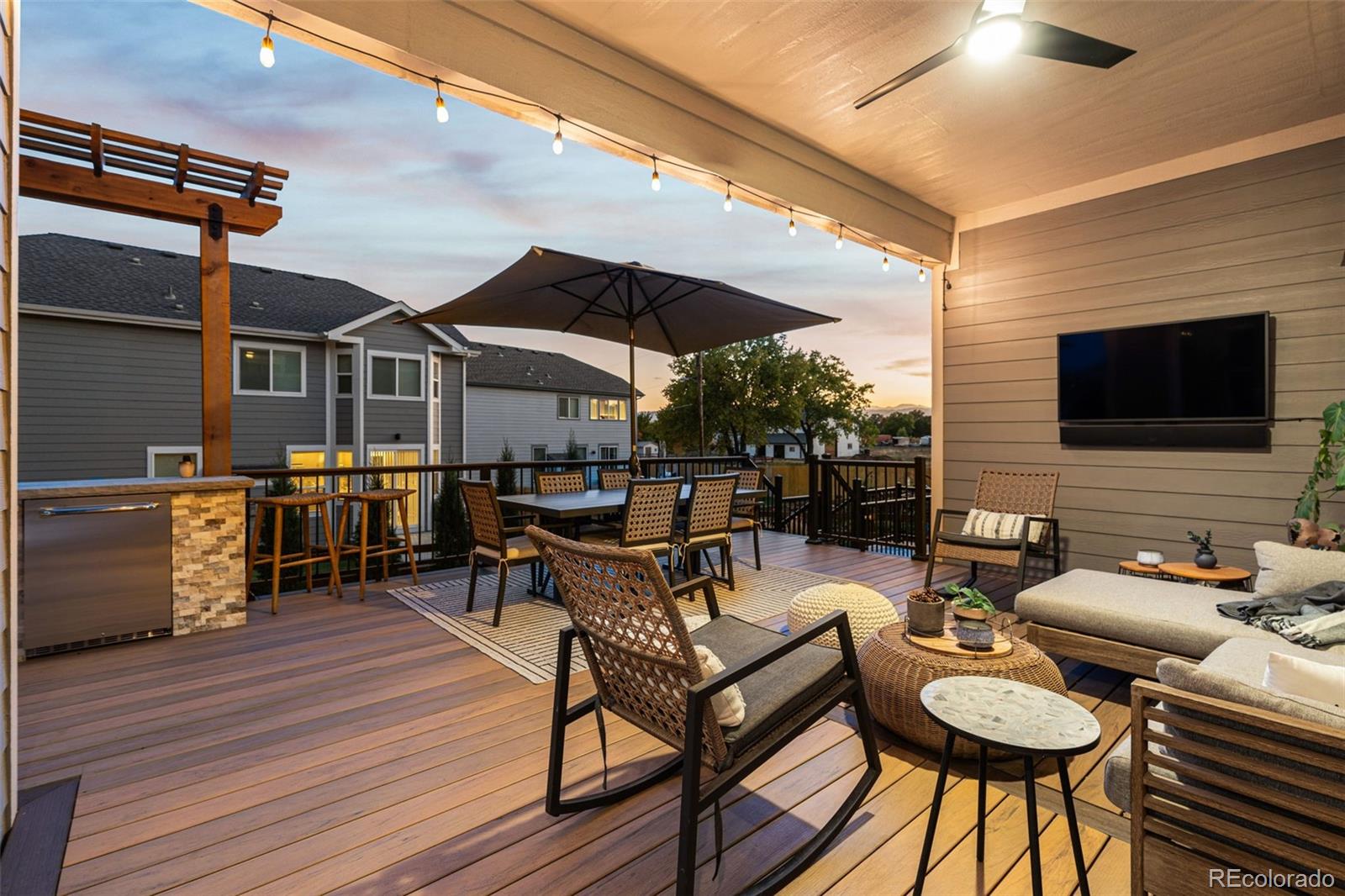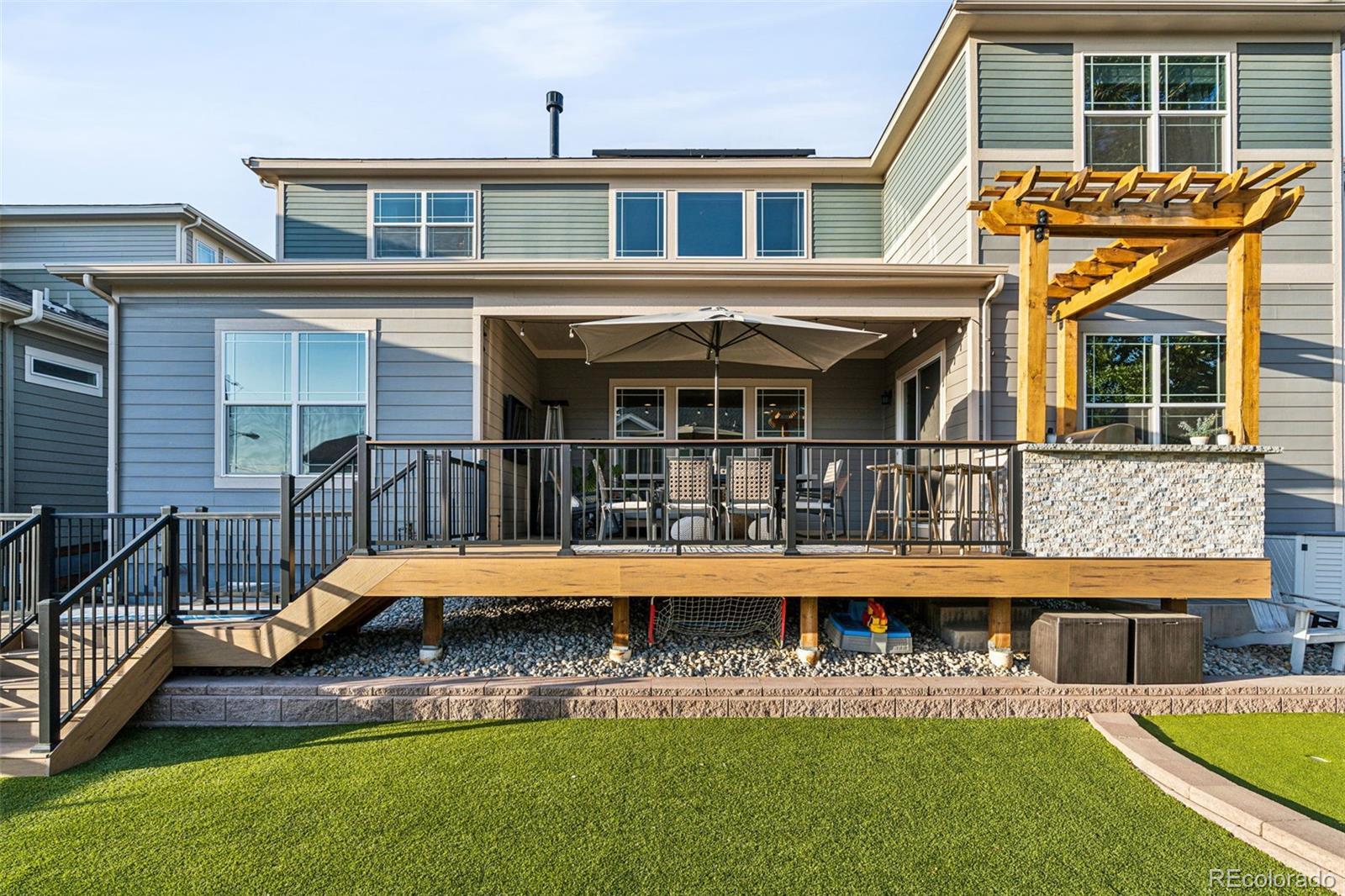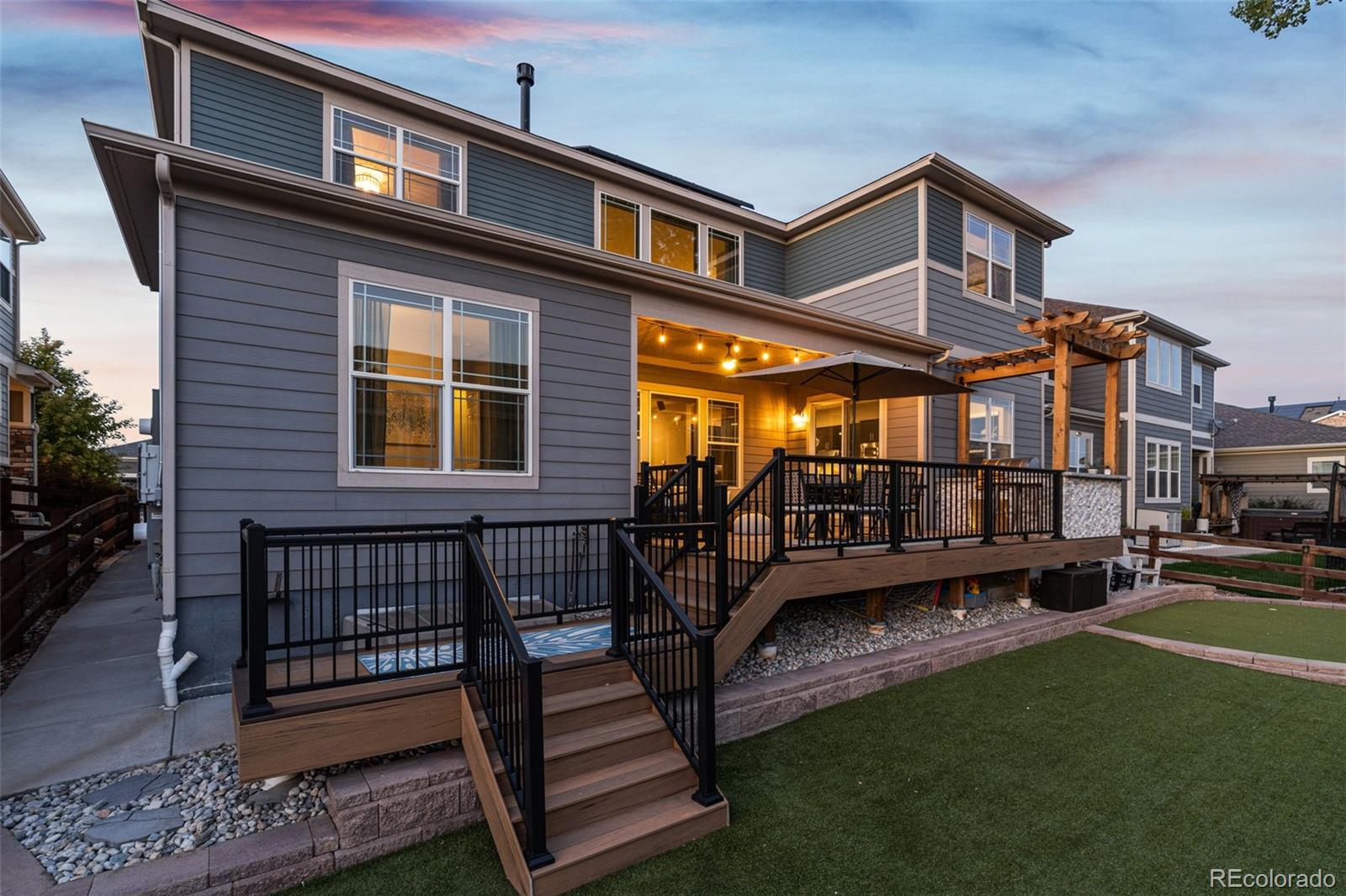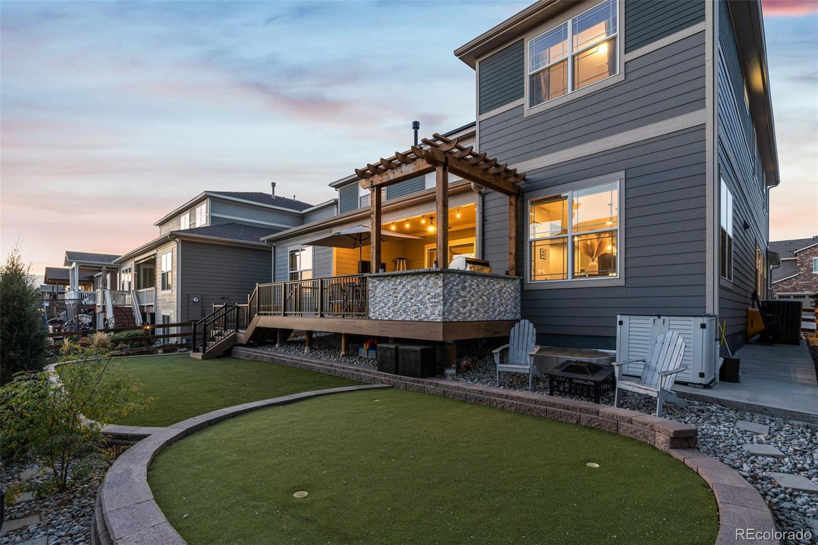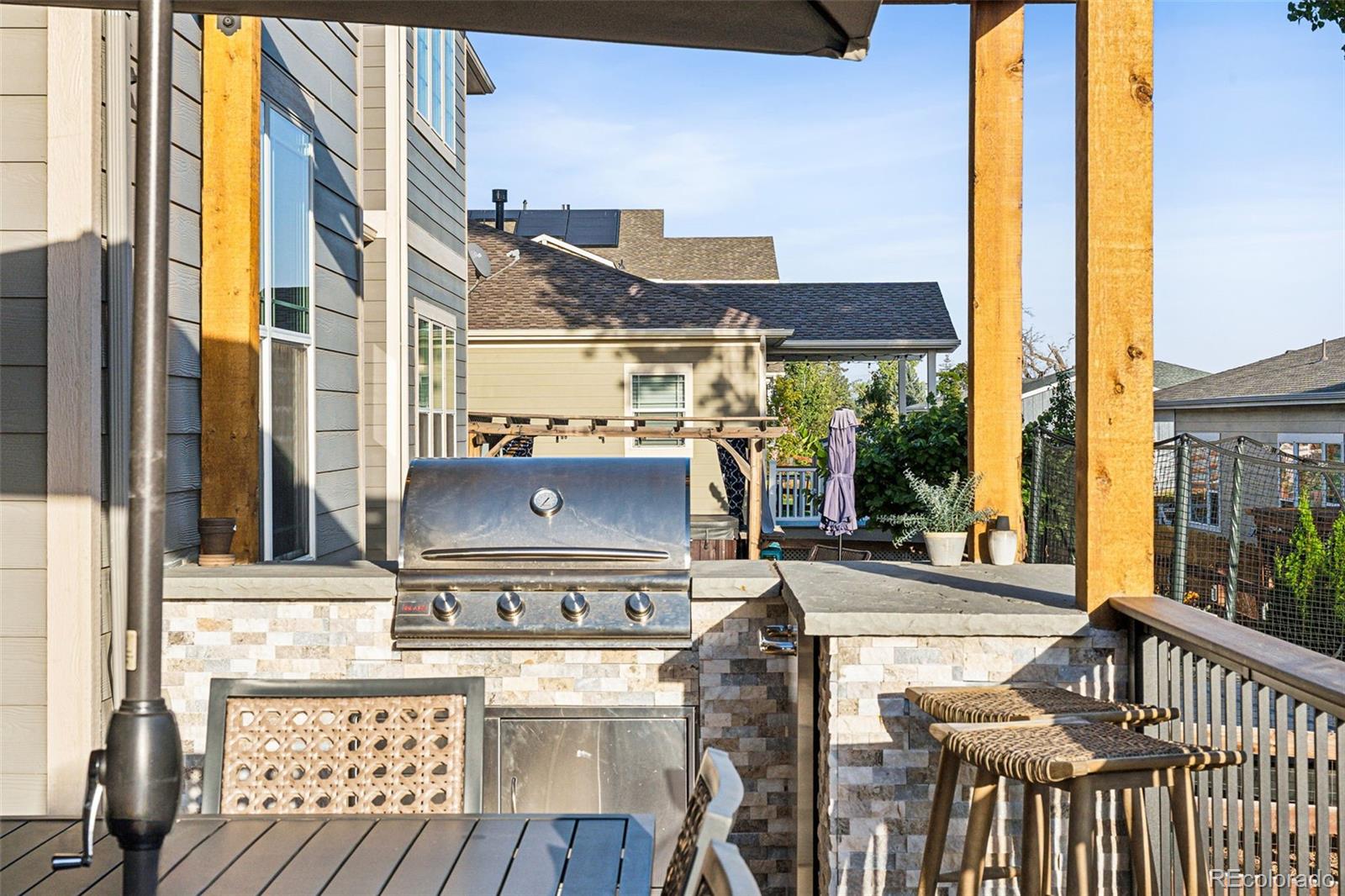 Welcome to this exceptional home, featuring the largest and most desirable floor plan in the community. Nestled in a beautifully manicured and tranquil neighborhood, it boasts striking curb appeal and a grand two-story entry. The main level offers a spacious open kitchen with a large island, seating, a double oven, gas range, and both a butler's and walk-in pantry. The dramatic two-story living room is bathed in natural light from floor-to-ceiling windows and features a gas fireplace with a tile surround. Also on this level are a formal dining room, an eat-in dining area, a private office with French doors and custom built-ins, a large guest suite with an ensuite bath, a well-designed mudroom with built-ins, and a powder room. Upstairs, the expansive primary suite showcases breathtaking southwest views, a luxurious five-piece ensuite bath, and a walk-in closet. Two additional spacious bedrooms share a Jack-and-Jill bath with dual sinks, while a versatile loft space could easily be enclosed for an additional bedroom. The unfinished basement offers incredible potential with a fantastic layout for future finishing and is currently utilized as a gym, play space, and storage area. Step outside into a true Colorado dream backyard--featuring a large, partially covered composite deck, a built-in outdoor kitchen, a putting green, and stunning Front Range views. The oversized three-car garage provides ample parking and storage. Additional highlights include a brand-new dishwasher, elegant light fixtures, Hunter Douglas electronic window treatments, under-cabinet lighting, and a smart thermostat. Solar panels that bring the electric bill to an average of about $30/month! This home truly has it all--located in one of Arvada's most sought-after neighborhoods, where opportunities like this are rare.