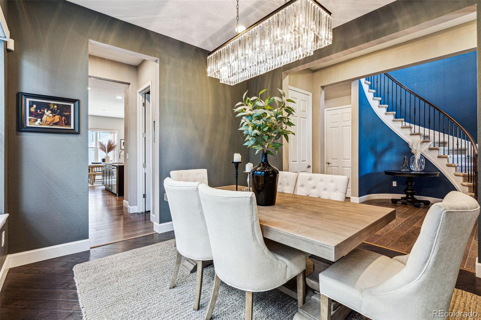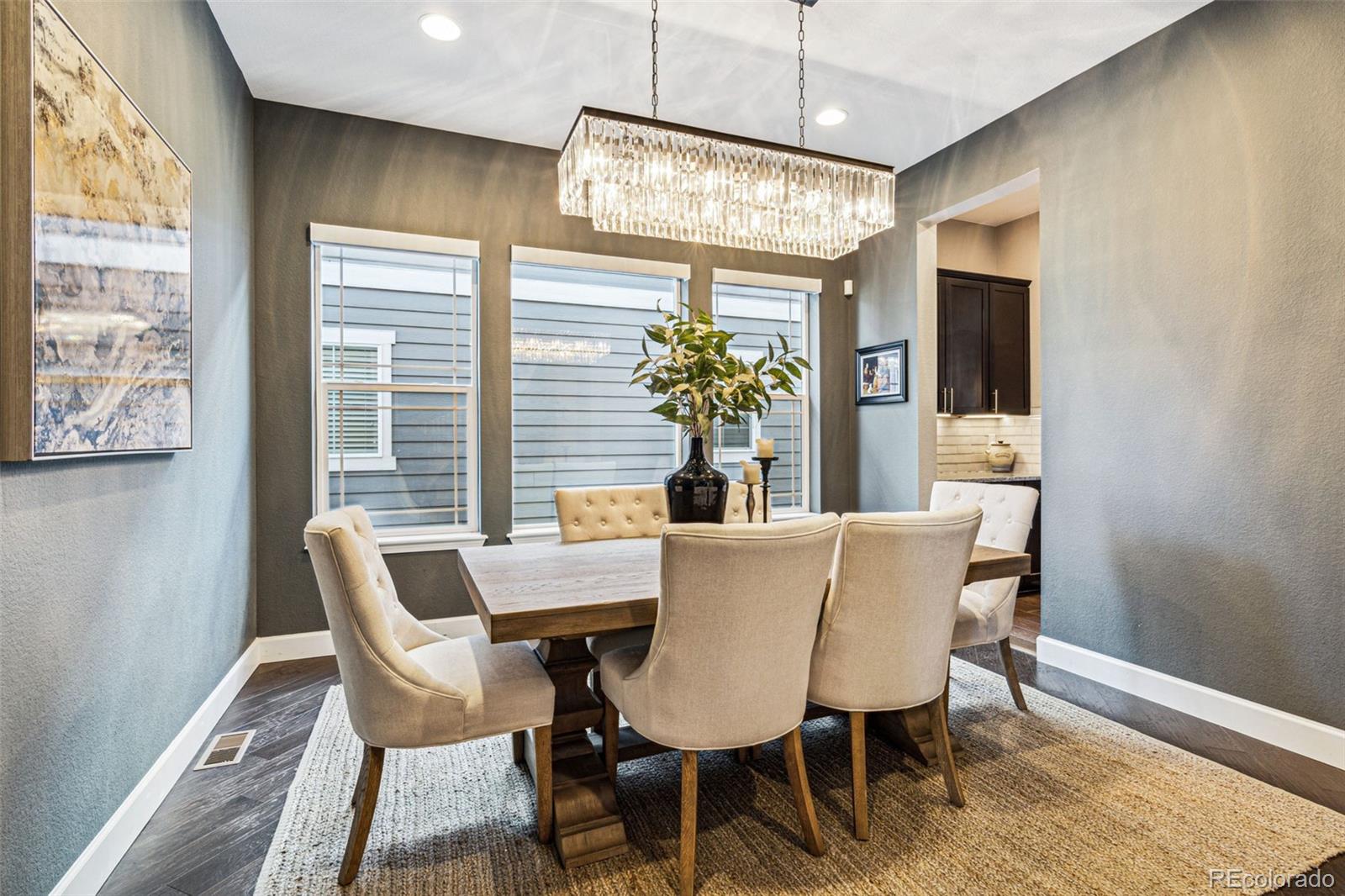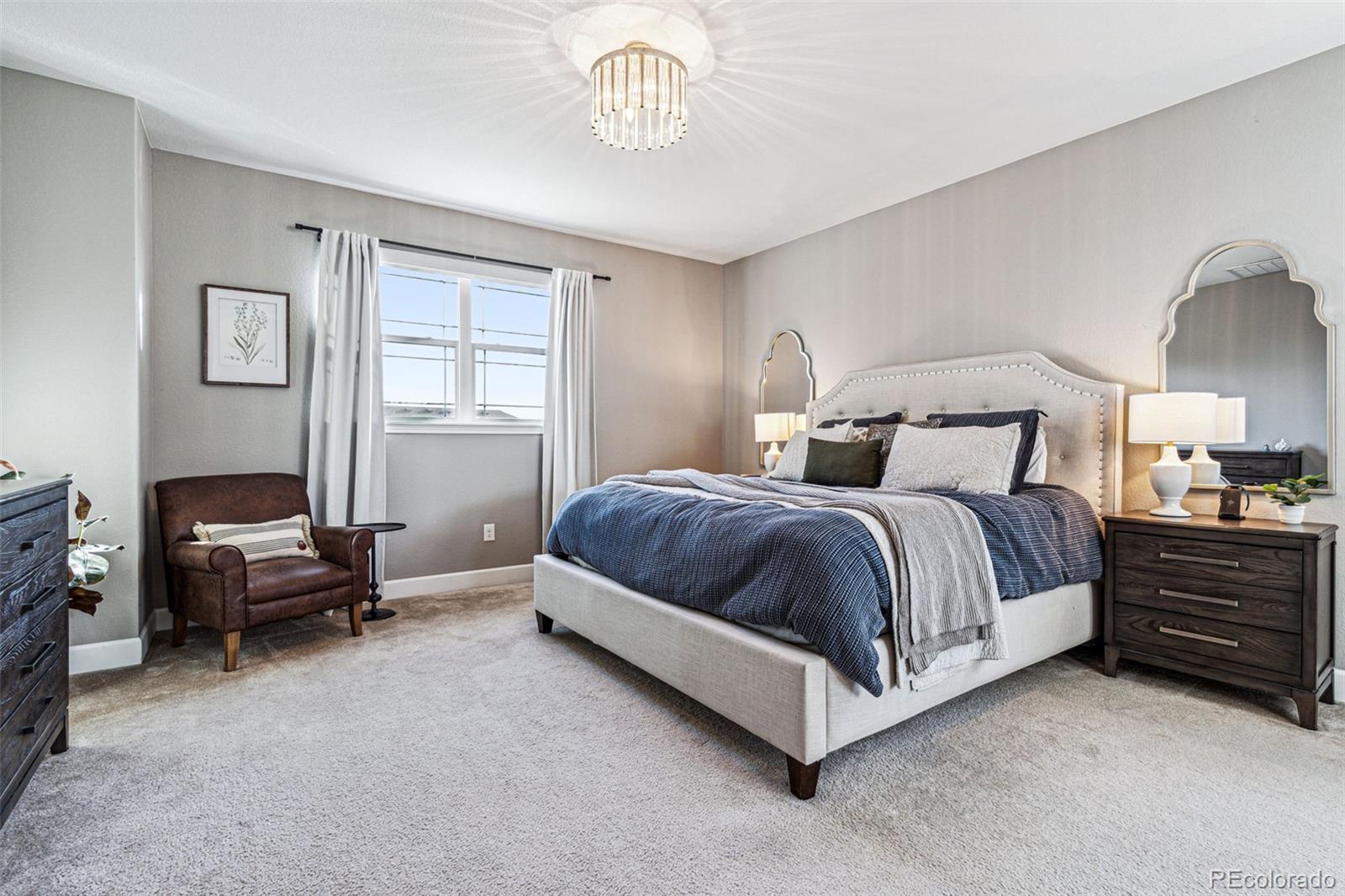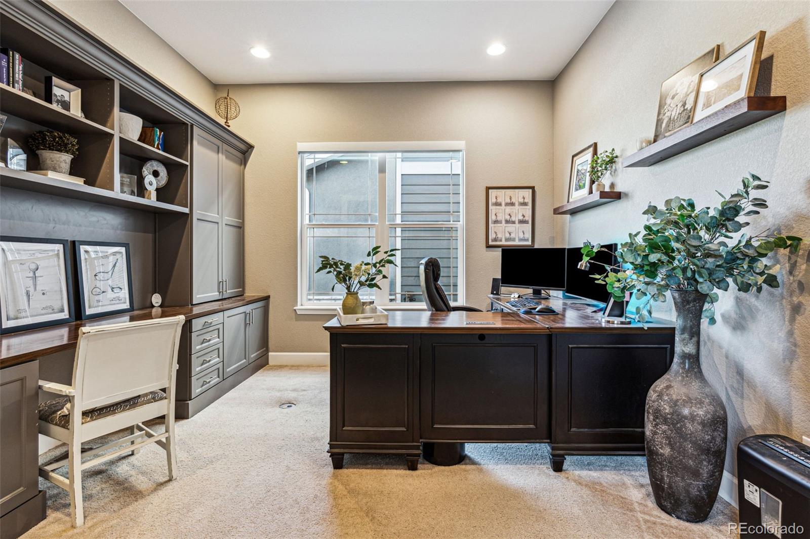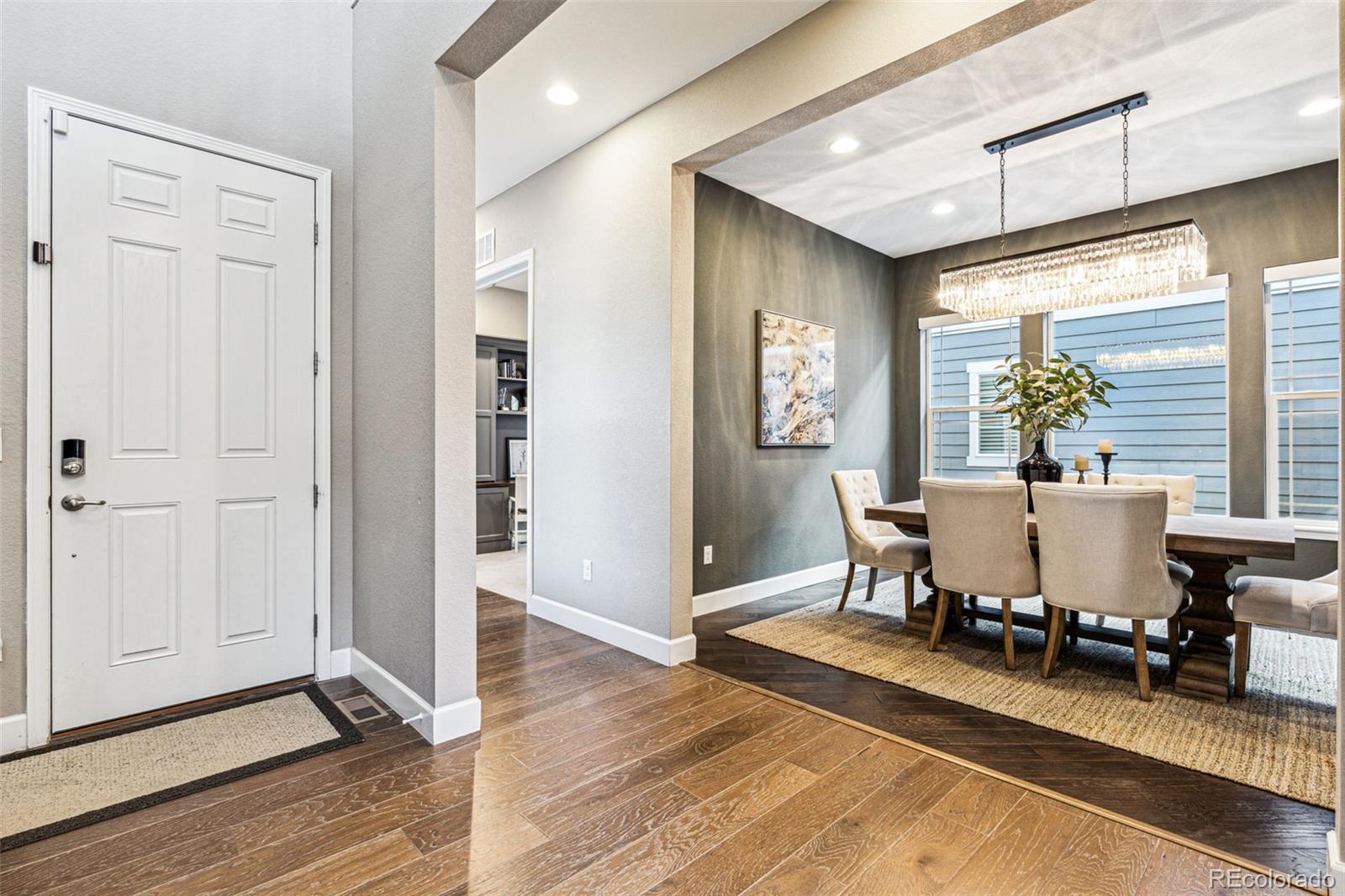 Welcome to this exceptional home, featuring the largest and most desirable floor plan in the community. Nestled in a beautifully manicured and tranquil neighborhood, it boasts striking curb appeal and a grand two-story entry. The main level offers a spacious open kitchen with a large island, seating, a double oven, gas range, and both a butler's and walk-in pantry. The dramatic two-story living room is bathed in natural light from floor-to-ceiling windows and features a gas fireplace with a tile surround. Also on this level are a formal dining room, an eat-in dining area, a private office with French doors and custom built-ins, a large guest suite with an ensuite bath, a well-designed mudroom with built-ins, and a powder room. Upstairs, the expansive primary suite showcases breathtaking southwest views, a luxurious five-piece ensuite bath, and a walk-in closet. Two additional spacious bedrooms share a Jack-and-Jill bath with dual sinks, while a versatile loft space could easily be enclosed for an additional bedroom. The unfinished basement offers incredible potential with a fantastic layout for future finishing and is currently utilized as a gym, play space, and storage area. Step outside into a true Colorado dream backyard--featuring a large, partially covered composite deck, a built-in outdoor kitchen, a putting green, and stunning Front Range views. The oversized three-car garage provides ample parking and storage. Additional highlights include a brand-new dishwasher, elegant light fixtures, Hunter Douglas electronic window treatments, under-cabinet lighting, and a smart thermostat. Solar panels that bring the electric bill to an average of about $30/month! This home truly has it all--located in one of Arvada's most sought-after neighborhoods, where opportunities like this are rare.