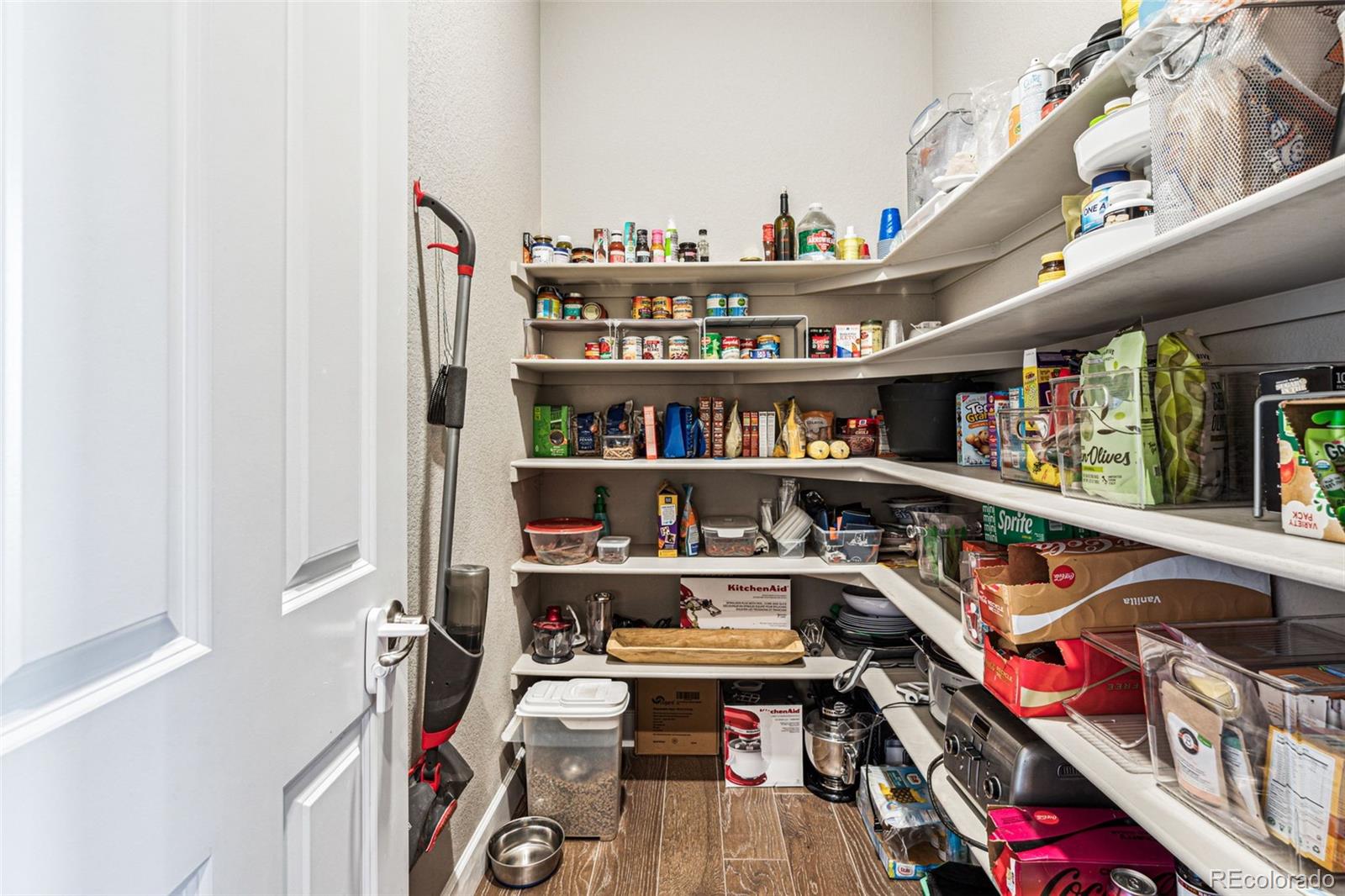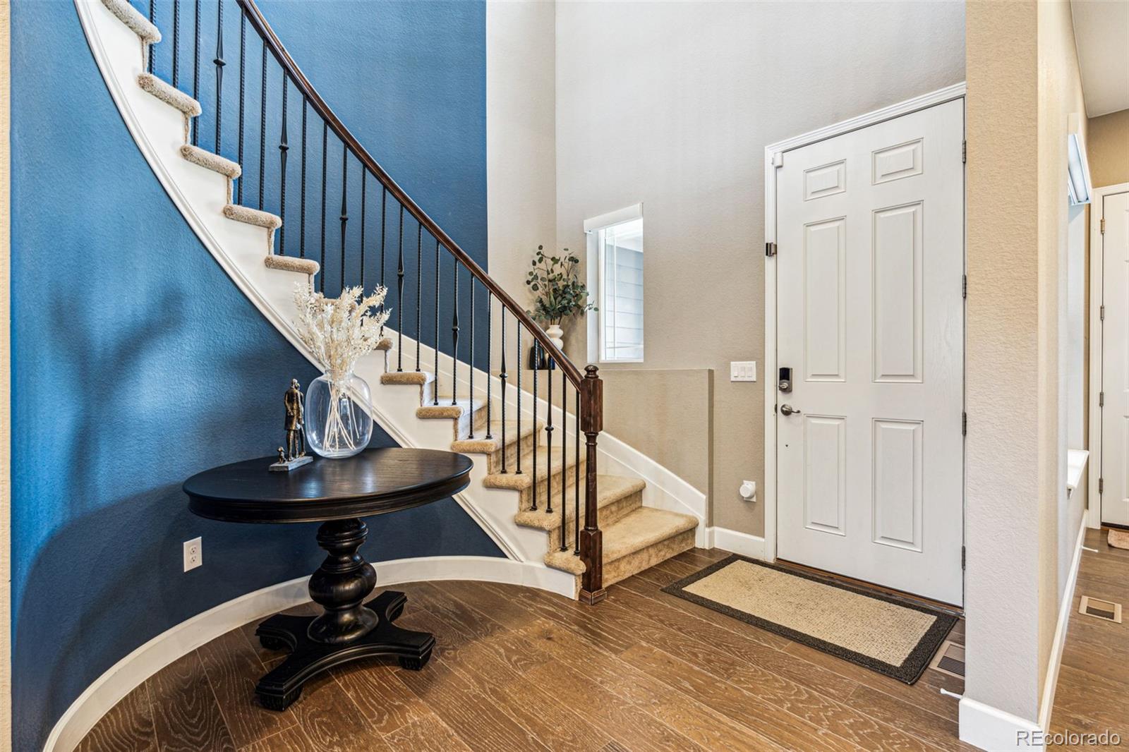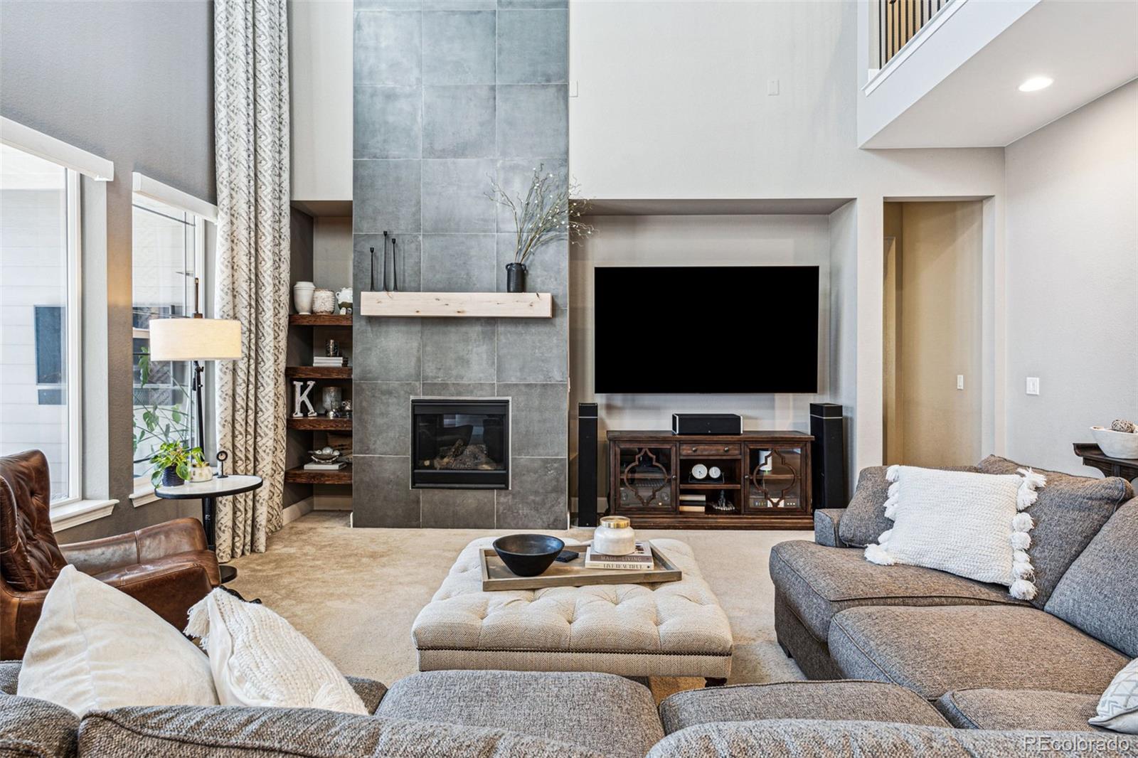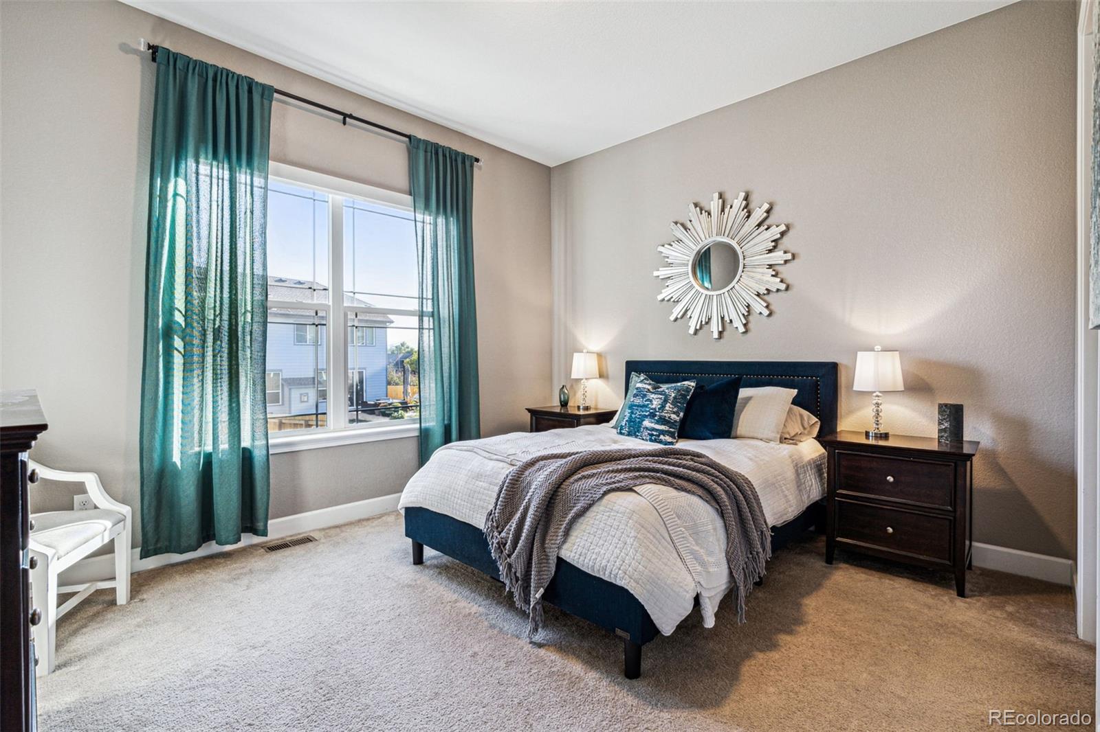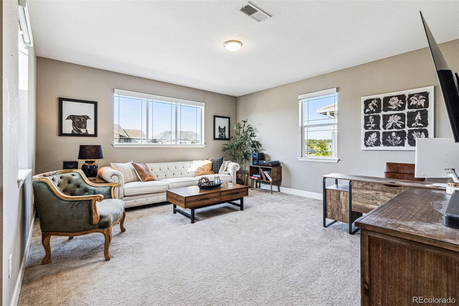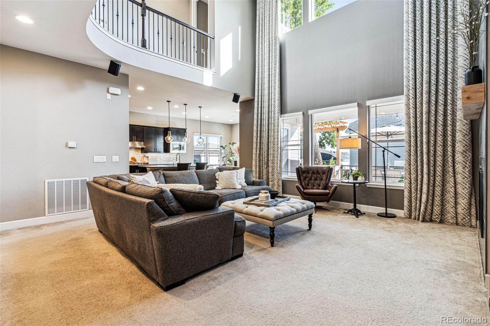 Welcome to this exceptional home, featuring the largest and most desirable floor plan in the community. Nestled in a beautifully manicured and tranquil neighborhood, it boasts striking curb appeal and a grand two-story entry. The main level offers a spacious open kitchen with a large island, seating, a double oven, gas range, and both a butler's and walk-in pantry. The dramatic two-story living room is bathed in natural light from floor-to-ceiling windows and features a gas fireplace with a tile surround. Also on this level are a formal dining room, an eat-in dining area, a private office with French doors and custom built-ins, a large guest suite with an ensuite bath, a well-designed mudroom with built-ins, and a powder room. Upstairs, the expansive primary suite showcases breathtaking southwest views, a luxurious five-piece ensuite bath, and a walk-in closet. Two additional spacious bedrooms share a Jack-and-Jill bath with dual sinks, while a versatile loft space could easily be enclosed for an additional bedroom. The unfinished basement offers incredible potential with a fantastic layout for future finishing and is currently utilized as a gym, play space, and storage area. Step outside into a true Colorado dream backyard--featuring a large, partially covered composite deck, a built-in outdoor kitchen, a putting green, and stunning Front Range views. The oversized three-car garage provides ample parking and storage. Additional highlights include a brand-new dishwasher, elegant light fixtures, Hunter Douglas electronic window treatments, under-cabinet lighting, and a smart thermostat. Solar panels that bring the electric bill to an average of about $30/month! This home truly has it all--located in one of Arvada's most sought-after neighborhoods, where opportunities like this are rare.