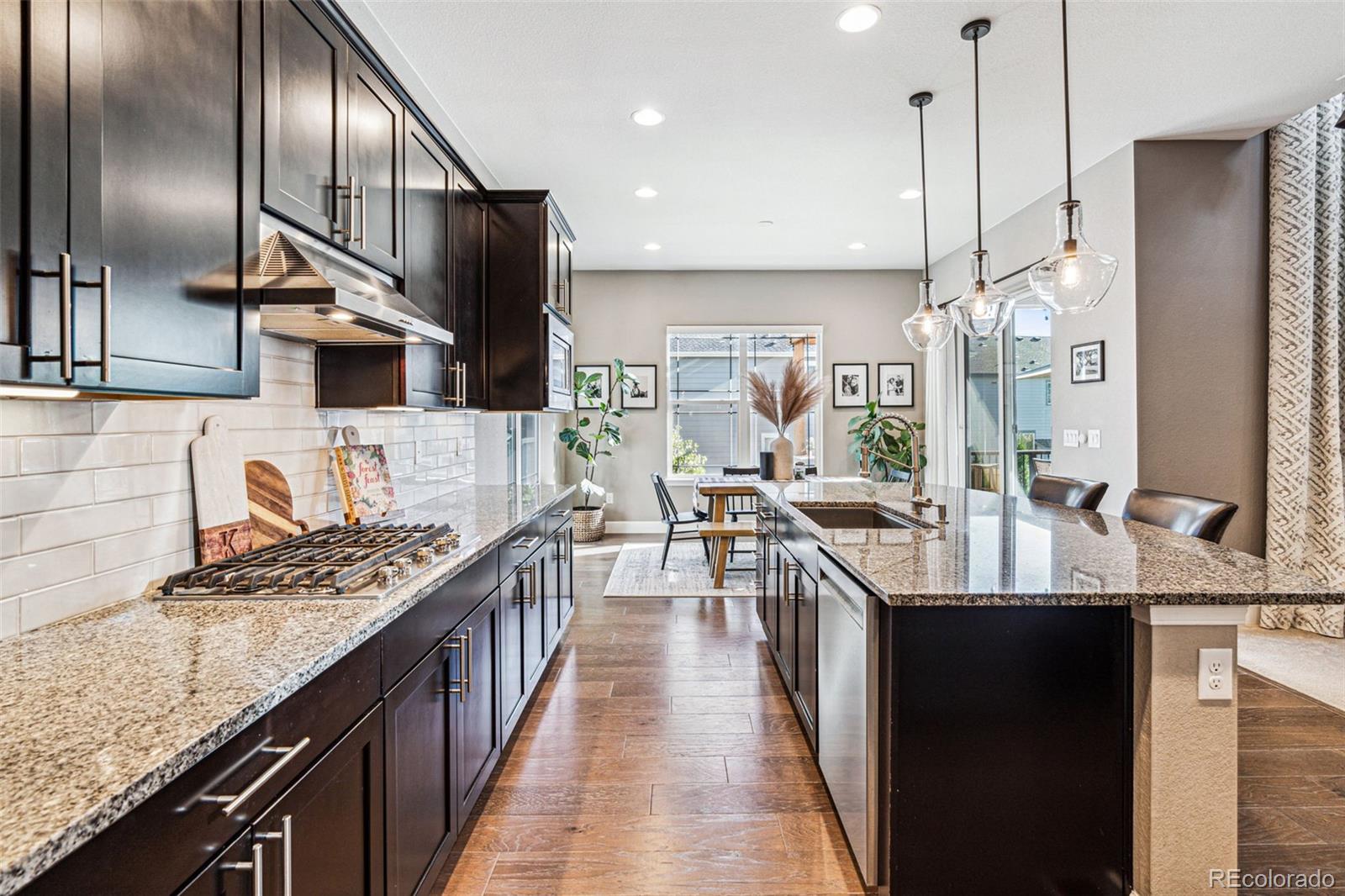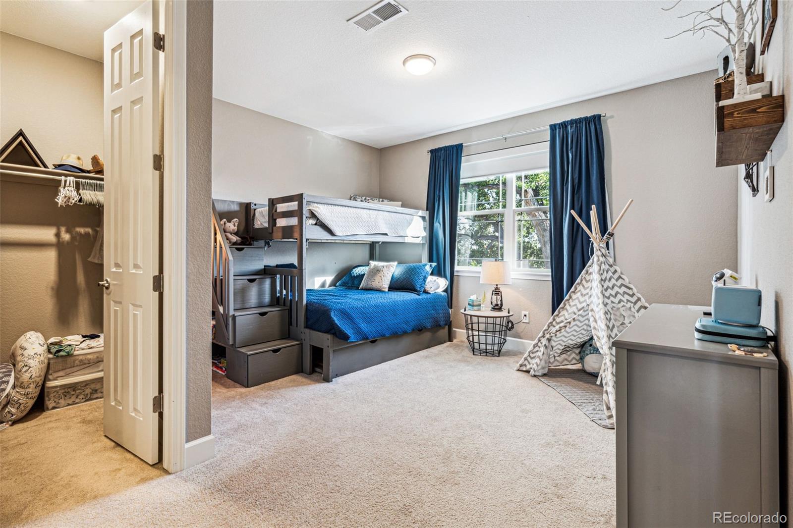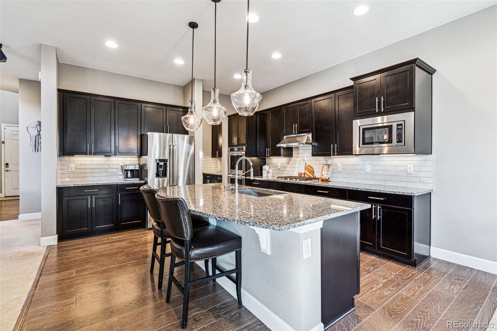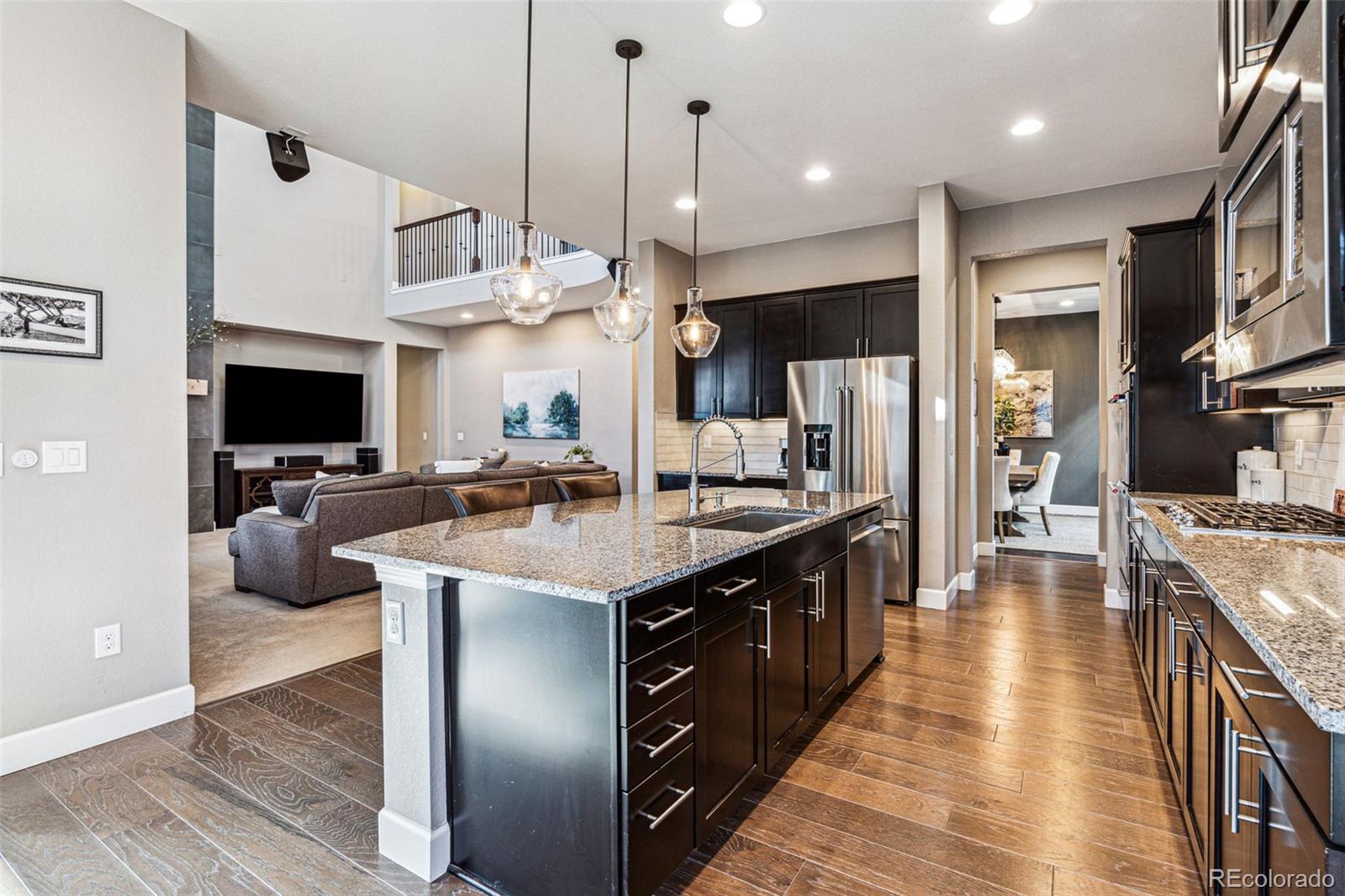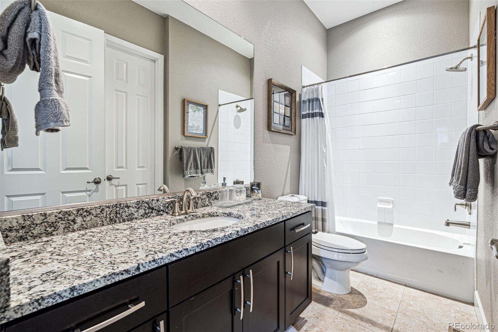 Welcome to this exceptional home, featuring the largest and most desirable floor plan in the community. Nestled in a beautifully manicured and tranquil neighborhood, it boasts striking curb appeal and a grand two-story entry. The main level offers a spacious open kitchen with a large island, seating, a double oven, gas range, and both a butler's and walk-in pantry. The dramatic two-story living room is bathed in natural light from floor-to-ceiling windows and features a gas fireplace with a tile surround. Also on this level are a formal dining room, an eat-in dining area, a private office with French doors and custom built-ins, a large guest suite with an ensuite bath, a well-designed mudroom with built-ins, and a powder room. Upstairs, the expansive primary suite showcases breathtaking southwest views, a luxurious five-piece ensuite bath, and a walk-in closet. Two additional spacious bedrooms share a Jack-and-Jill bath with dual sinks, while a versatile loft space could easily be enclosed for an additional bedroom. The unfinished basement offers incredible potential with a fantastic layout for future finishing and is currently utilized as a gym, play space, and storage area. Step outside into a true Colorado dream backyard--featuring a large, partially covered composite deck, a built-in outdoor kitchen, a putting green, and stunning Front Range views. The oversized three-car garage provides ample parking and storage. Additional highlights include a brand-new dishwasher, elegant light fixtures, Hunter Douglas electronic window treatments, under-cabinet lighting, and a smart thermostat. Solar panels that bring the electric bill to an average of about $30/month! This home truly has it all--located in one of Arvada's most sought-after neighborhoods, where opportunities like this are rare.