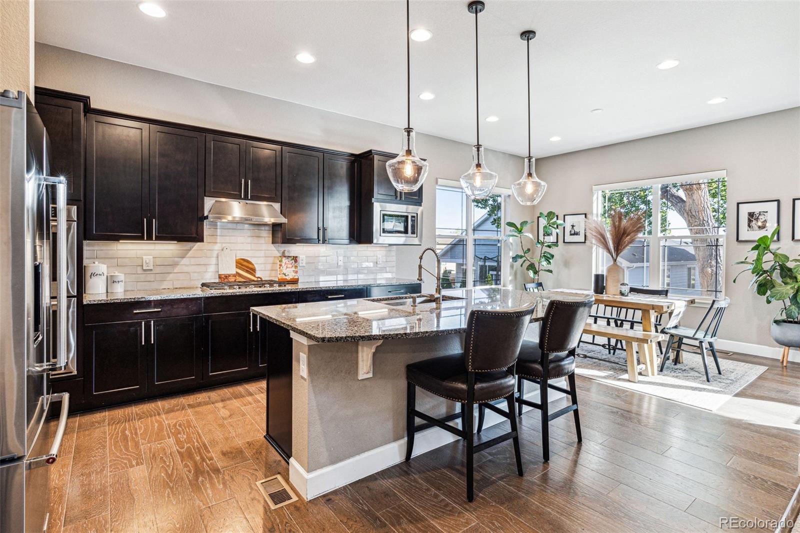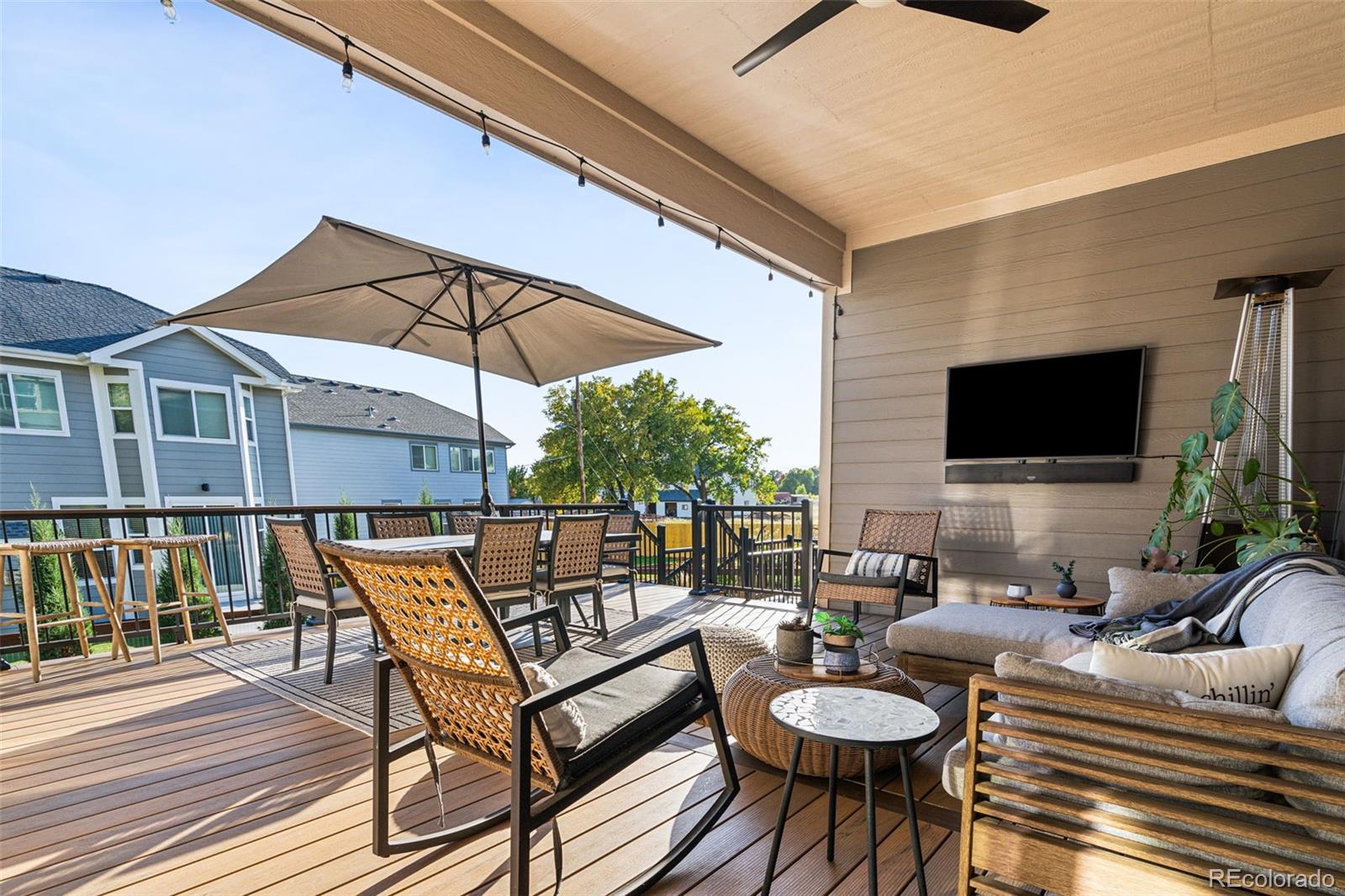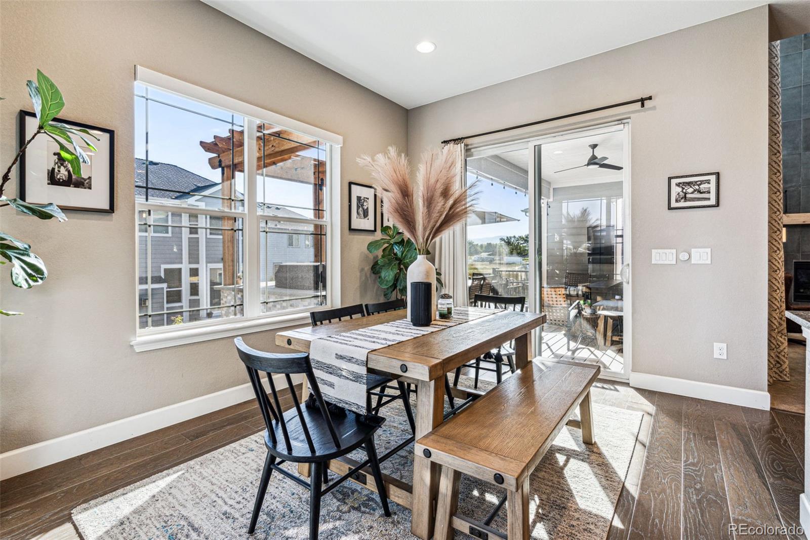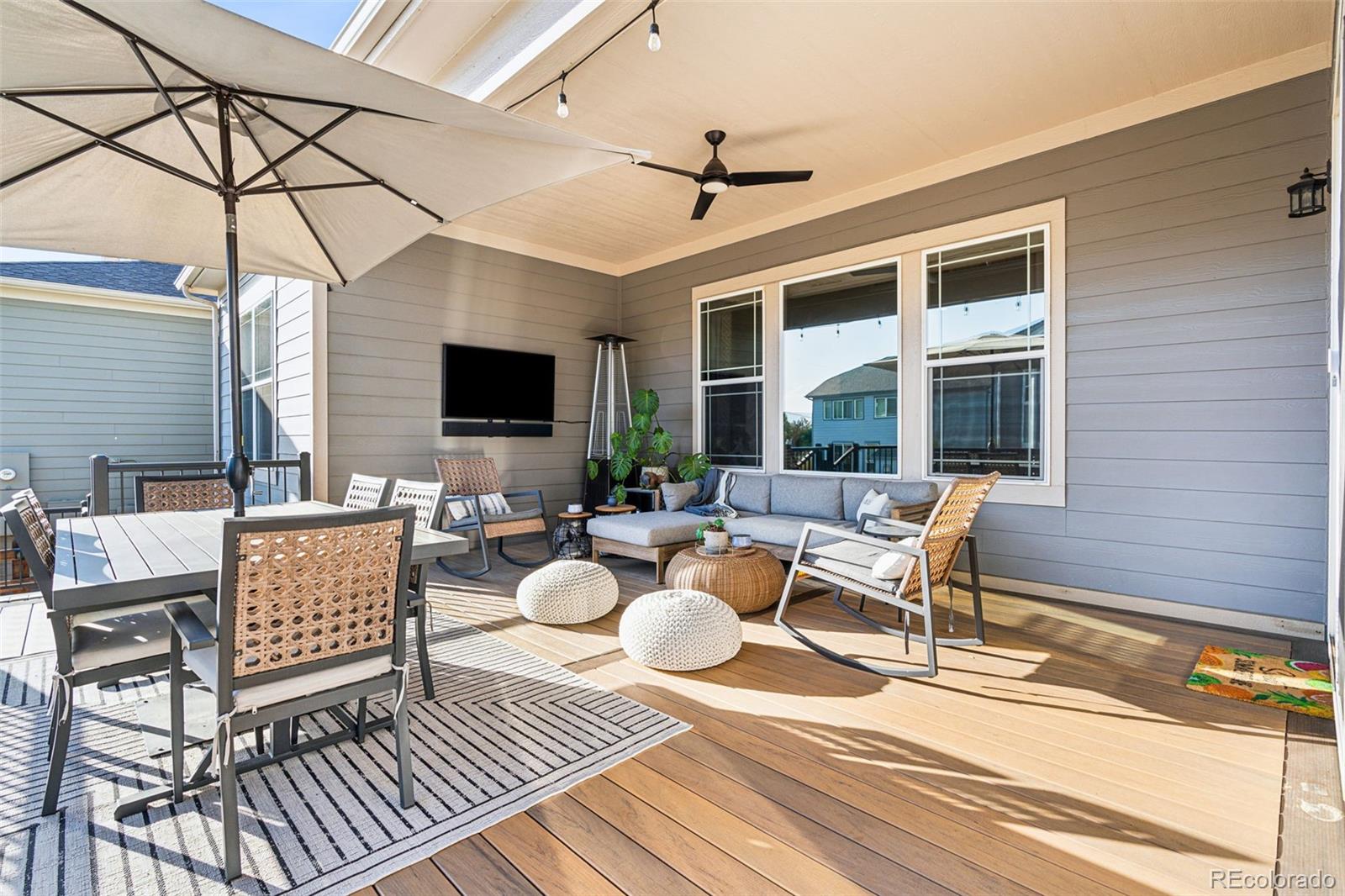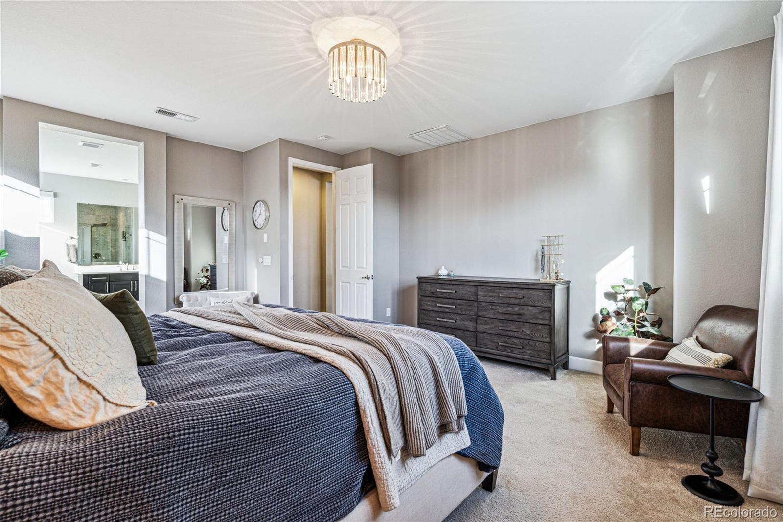 Welcome to this exceptional home, featuring the largest and most desirable floor plan in the community. Nestled in a beautifully manicured and tranquil neighborhood, it boasts striking curb appeal and a grand two-story entry. The main level offers a spacious open kitchen with a large island, seating, a double oven, gas range, and both a butler's and walk-in pantry. The dramatic two-story living room is bathed in natural light from floor-to-ceiling windows and features a gas fireplace with a tile surround. Also on this level are a formal dining room, an eat-in dining area, a private office with French doors and custom built-ins, a large guest suite with an ensuite bath, a well-designed mudroom with built-ins, and a powder room. Upstairs, the expansive primary suite showcases breathtaking southwest views, a luxurious five-piece ensuite bath, and a walk-in closet. Two additional spacious bedrooms share a Jack-and-Jill bath with dual sinks, while a versatile loft space could easily be enclosed for an additional bedroom. The unfinished basement offers incredible potential with a fantastic layout for future finishing and is currently utilized as a gym, play space, and storage area. Step outside into a true Colorado dream backyard--featuring a large, partially covered composite deck, a built-in outdoor kitchen, a putting green, and stunning Front Range views. The oversized three-car garage provides ample parking and storage. Additional highlights include a brand-new dishwasher, elegant light fixtures, Hunter Douglas electronic window treatments, under-cabinet lighting, and a smart thermostat. Solar panels that bring the electric bill to an average of about $30/month! This home truly has it all--located in one of Arvada's most sought-after neighborhoods, where opportunities like this are rare.