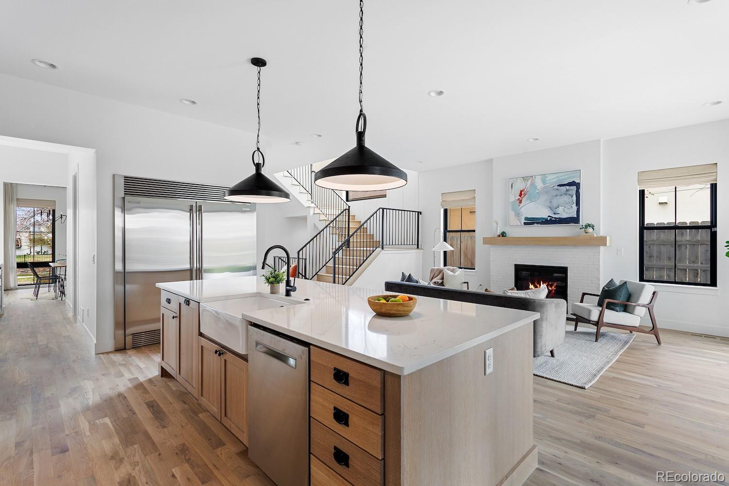 Nestled in Denver's coveted University neighborhood, this stunning residence offers the perfect blend of classic charm and modern luxury. Located just blocks from the University of Denver campus, this meticulously maintained home welcomes you with timeless curb appeal on a peaceful, tree-lined street. Inside you'll discover an open concept main floor featuring hardwood floors, abundant natural light, and thoughtful architectural details. The gourmet kitchen boasts custom cabinetry, high-end stainless steel appliances, quartz countertops, and a spacious island perfect for entertaining. A large pass-through with a walk-in pantry connects the kitchen to the dining room. Off of the kitchen, you'll find the spacious family room with a gas fireplace and access to the backyard and outdoor cooking area. The upper level features a luxurious primary suite with a spa-inspired bathroom and walk-in closet, plus two additional well-appointed bedrooms separated by a spacious hallway. The finished basement provides versatile living space that could serve as a recreation room, family room, or bar area, and is adjoined by two bedrooms and a shared bathroom. Outside, enjoy the professionally landscaped yard with a covered patio completed with a built-in grilling area, mature trees, and perennial gardens - an ideal setting for outdoor gatherings or quiet relaxation. The detached garage offers secure parking and additional storage. Located in the highly rated Denver Public School district, this home provides easy access to Observatory Park, Washington Park, light rail, the DU campus, and an array of local shops and restaurants. This exceptional property offers the perfect opportunity to experience the best of Denver living in a premier location.