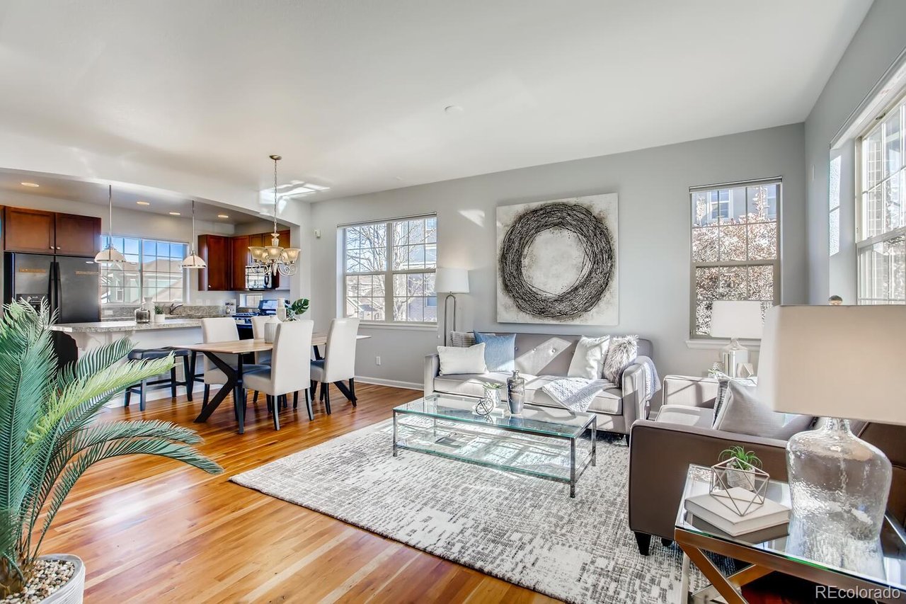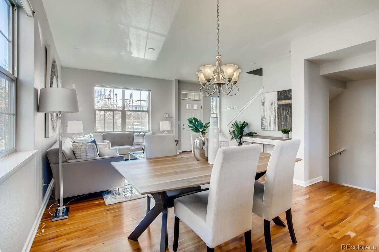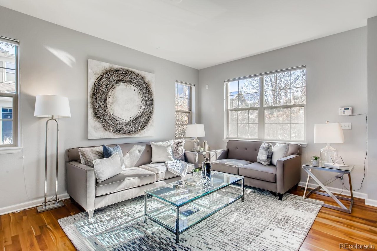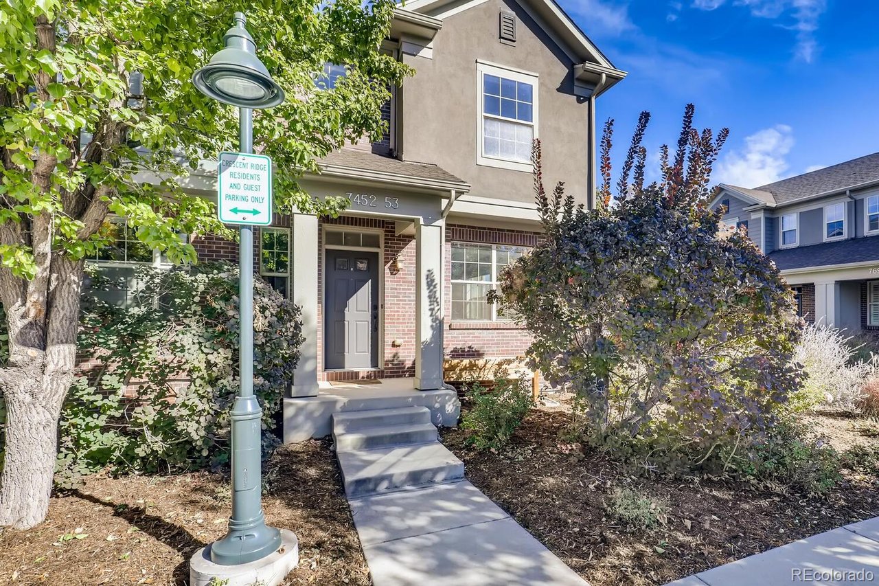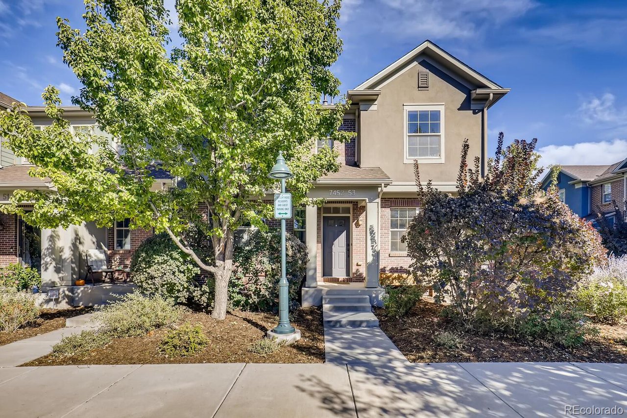 One of the best lots in Crescent Ridge at Lowry. Beautifully maintained and updated. Windows on the north, east and south flood all rooms with light. The main level welcomes you with a large open concept floor plan, perfect for entertaining. Gleaming hardwood floors throughout the main level. The second story has a spacious master suite with large walk in closet just down the hallway from two additional bedrooms and bathroom. Brand new carpet throughout the upper level is plush and soft. This home lives like a single family detached house, it has been exceptionally well kept, freshly painted, and is ready for its new owners. Enjoy your charming front porch one block from Crescent Park and minutes from the Lowry Town Center. Attached two car garage and an excellent HOA that maintains the beautiful landscaping.
