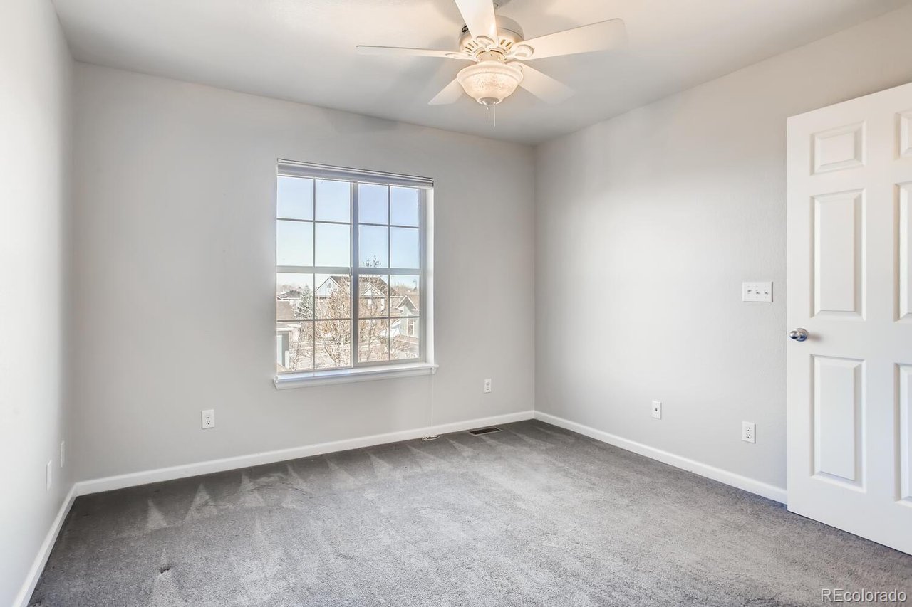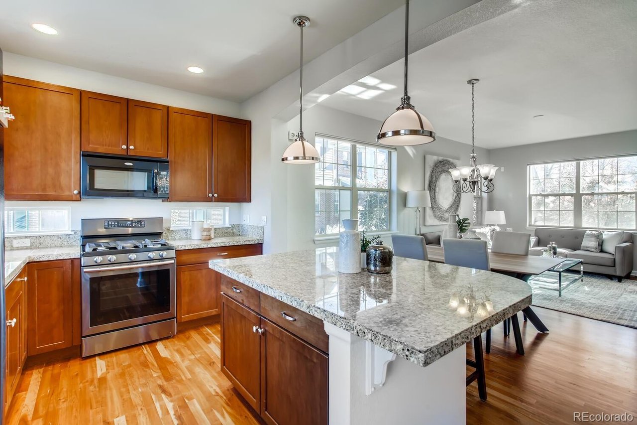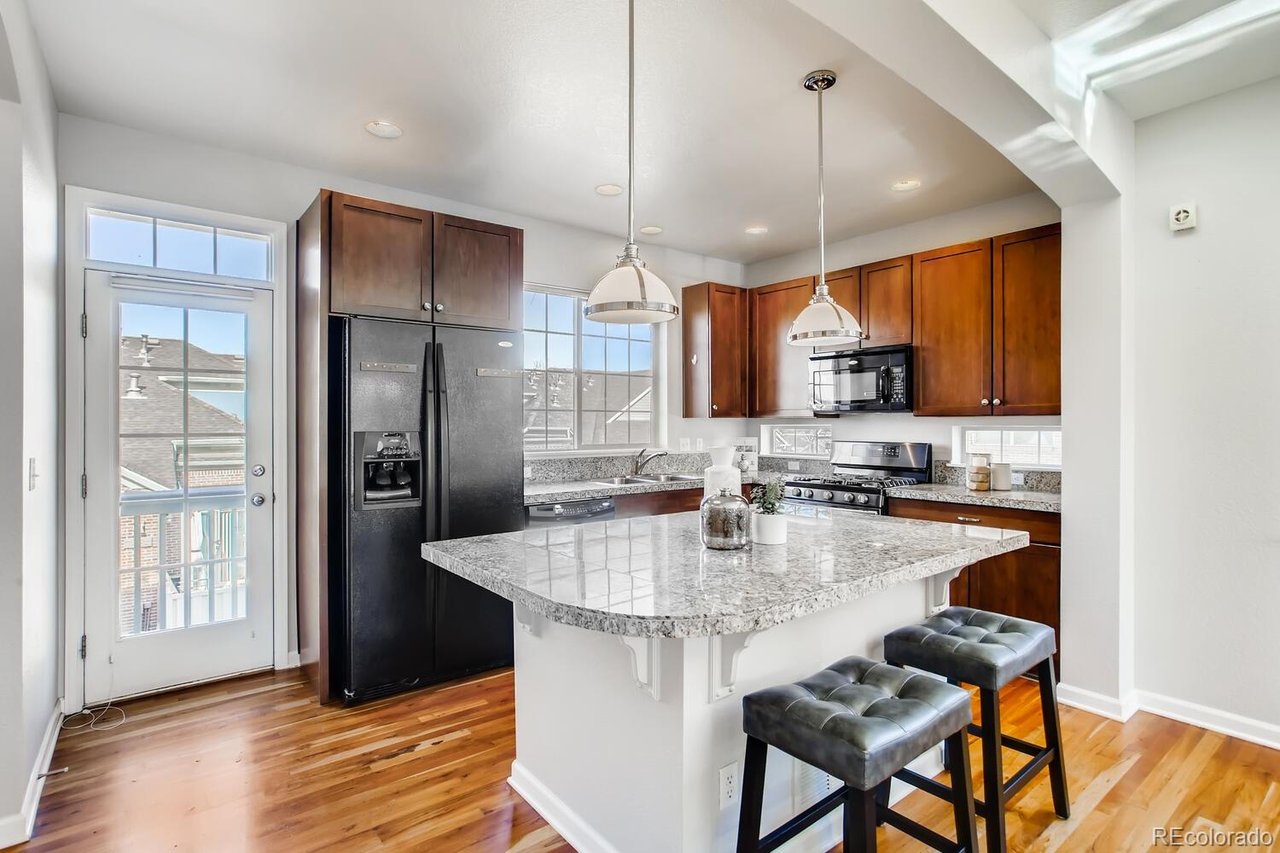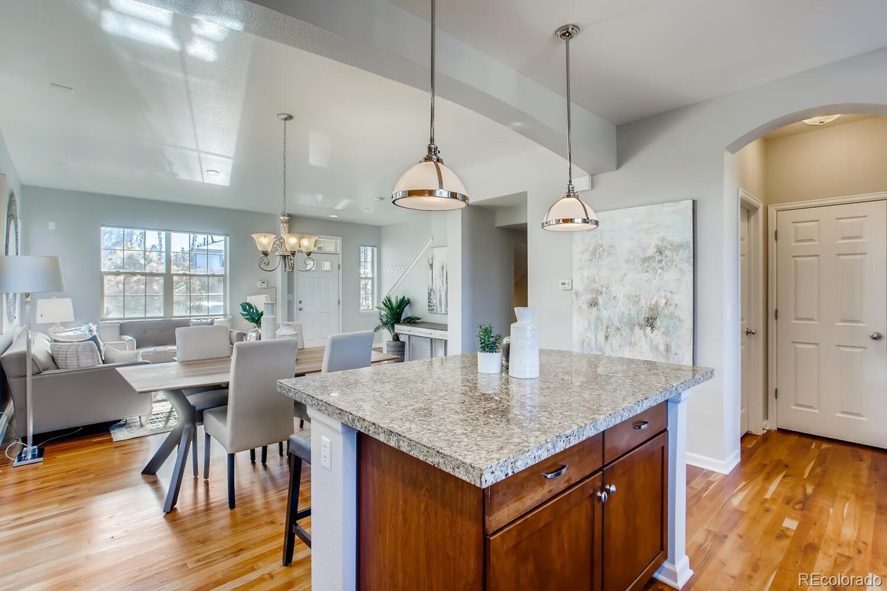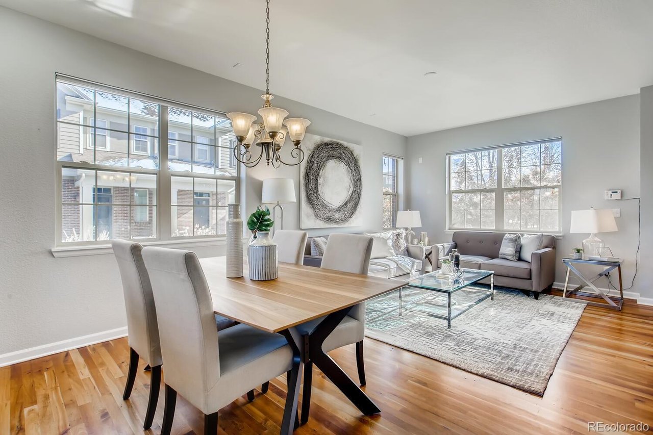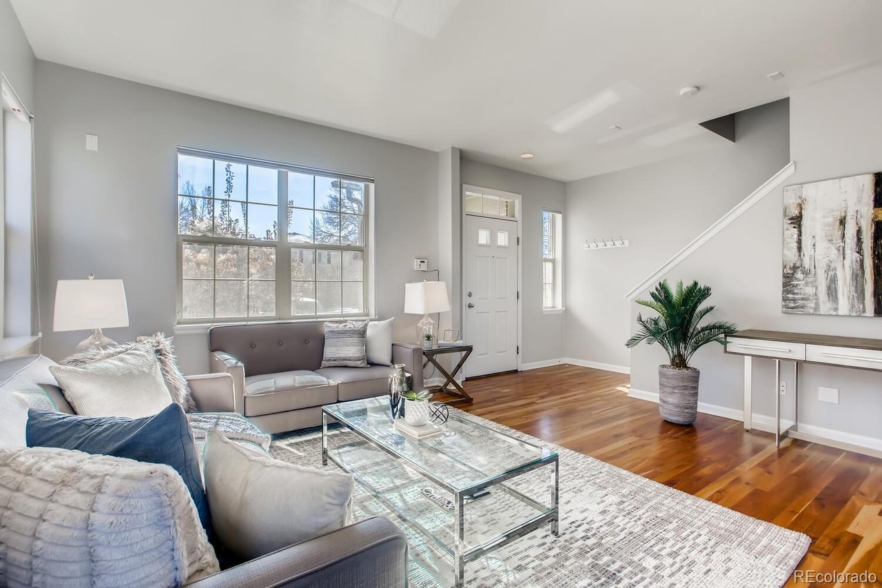 One of the best lots in Crescent Ridge at Lowry. Beautifully maintained and updated. Windows on the north, east and south flood all rooms with light. The main level welcomes you with a large open concept floor plan, perfect for entertaining. Gleaming hardwood floors throughout the main level. The second story has a spacious master suite with large walk in closet just down the hallway from two additional bedrooms and bathroom. Brand new carpet throughout the upper level is plush and soft. This home lives like a single family detached house, it has been exceptionally well kept, freshly painted, and is ready for its new owners. Enjoy your charming front porch one block from Crescent Park and minutes from the Lowry Town Center. Attached two car garage and an excellent HOA that maintains the beautiful landscaping.